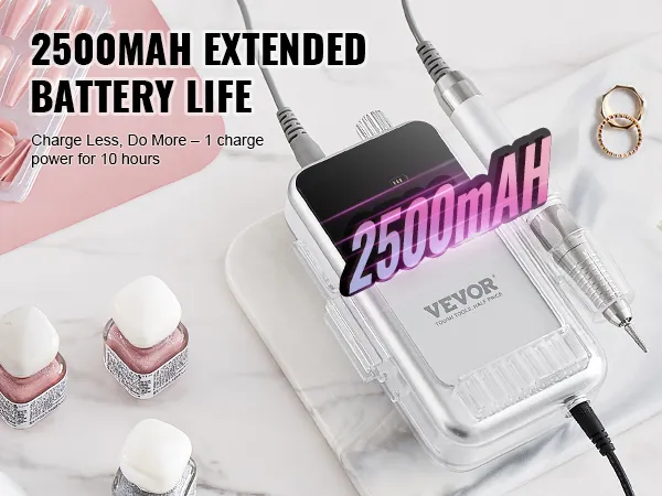 Met onze oplaadbare draadloze nagelvijl met een batterij met hoge capaciteit tot 2500 mAh hoeft u zich geen zorgen meer te maken over veelvuldig opladen. Geniet van maximaal 10 uur continu gebruik met één keer opladen.