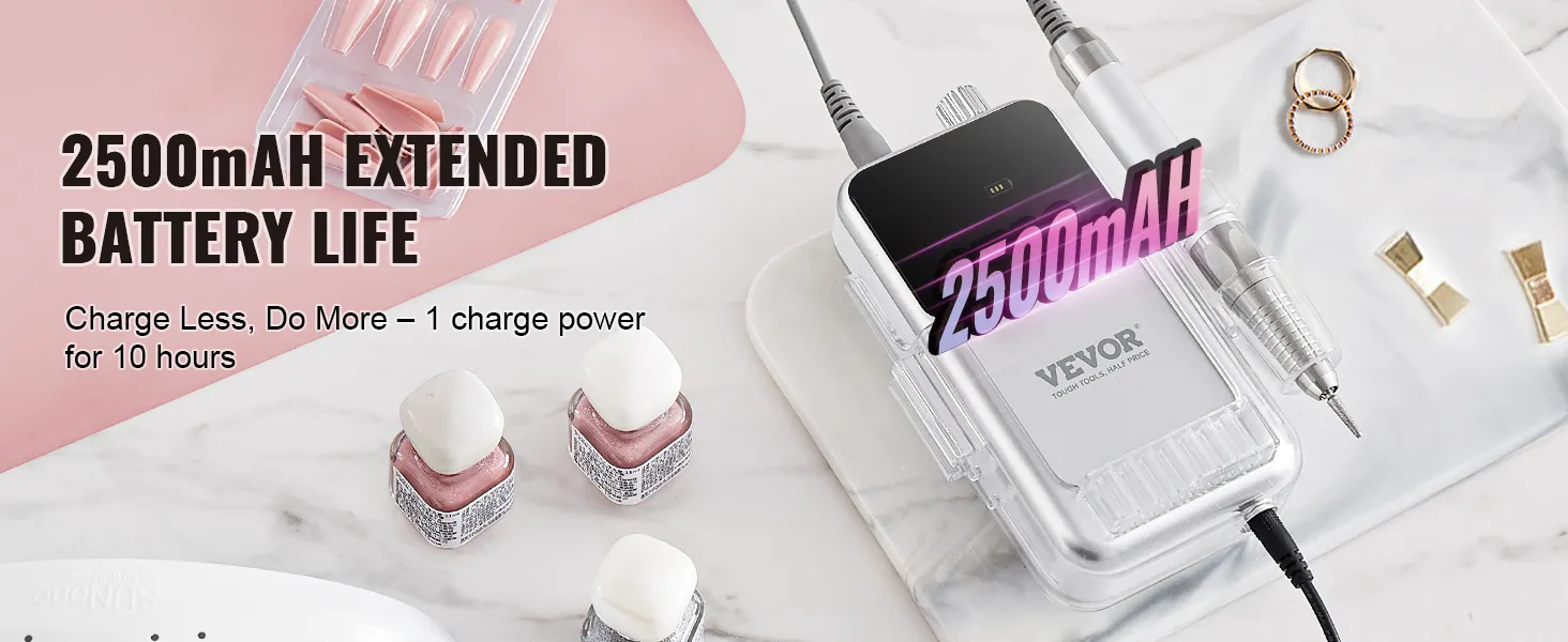 Minder opladen, meer doen: Met een batterij met hoge capaciteit van maximaal 2500 mAh kan deze oplaadbare draadloze nagelvijl tot 10 uur onafgebroken werken op één keer opladen, waardoor veelvuldig opladen niet meer nodig is. Dankzij het draadloze en draagbare ontwerp kun je altijd en overal je nagels doen, zonder dat je aan kabels vastzit.