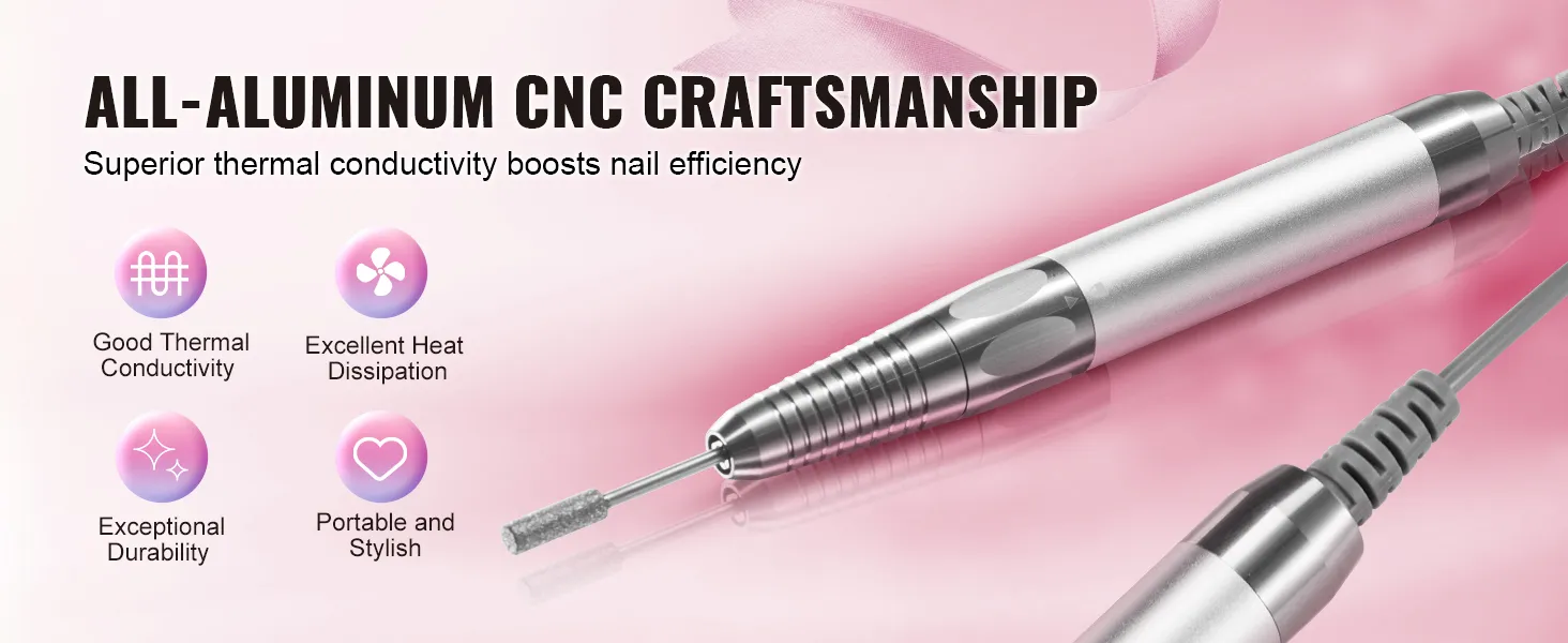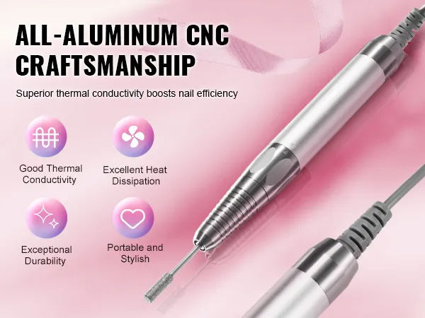 Hoogwaardige CNC-aluminiumconstructie: ons manicure- en pedicuregereedschap van hoogwaardig aluminium zorgt voor uitstekende duurzaamheid en stabiliteit voor langdurig gebruik. De uitstekende warmteafvoerende eigenschappen voorkomen oververhitting en zorgen voor een langere levensduur van uw nagelboor. Schoonheid ontmoet duurzaamheid en zorgt voor vreugdevolle momenten bij de verzorging van je nagels!