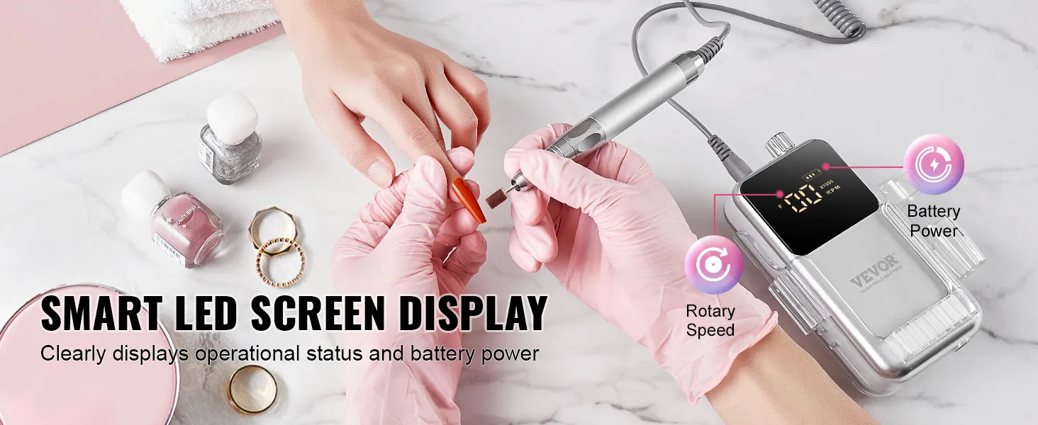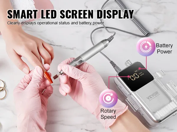 LCD-display met hoge resolutie: Met ons intelligente LCD-display behoudt u overzicht en controle tijdens de nagelverzorging. Selecteer eenvoudig de gewenste snelheid en controleer de bedrijfsstatus zoals snelheid en batterijniveau in realtime. Geniet van duidelijke en gemakkelijk leesbare informatie voor een naadloze nagelverzorgingservaring.