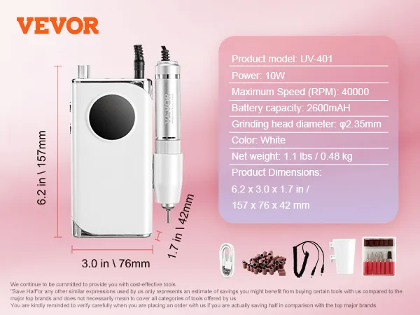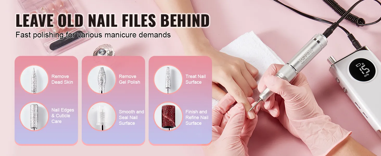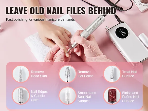 VEVOR electric cordless nail file comes complete with 6 grinding bits and 50 sanding bands, providing everything you need to remove dead skin, gel polish, and refine nail surfaces to perfection - perfect for beginners and professionals alike.