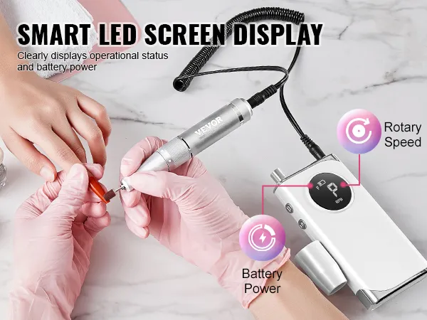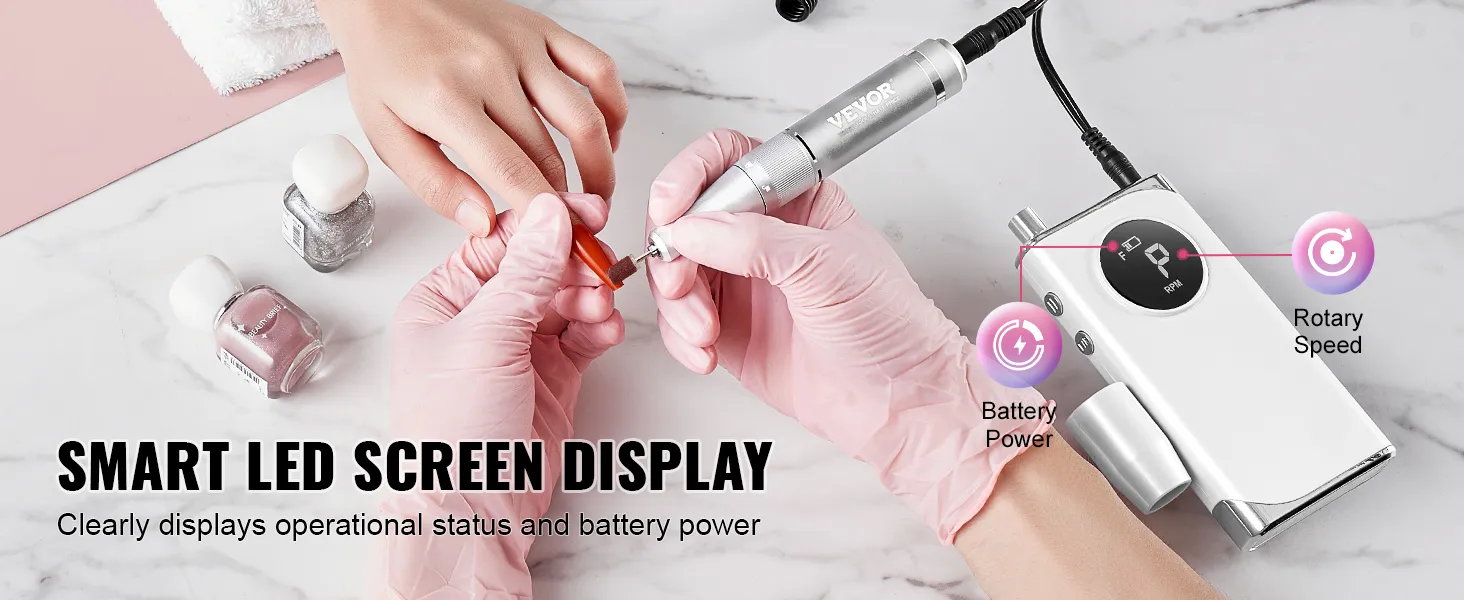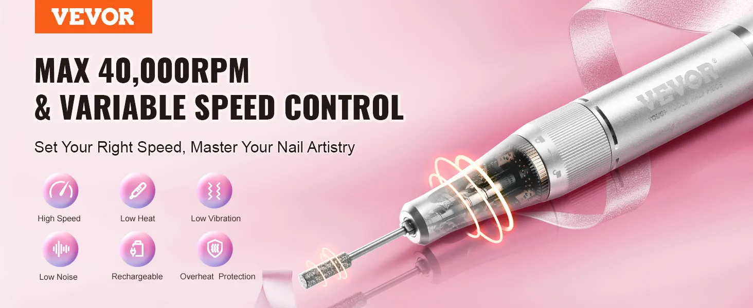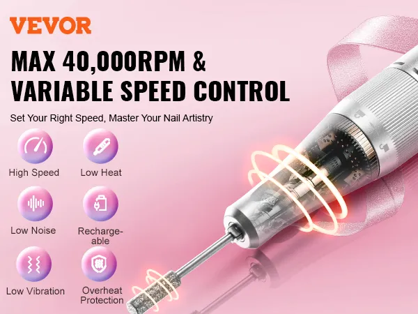 High Speed Up To 40,000RPM & Variable Speed Control: VEVOR electric cordless nail drill features a high-efficiency motor, reaching high speed of up to 40,000RPM, ensuring smooth nail polishing with minimal vibration and noise. Whether you're polishing, shaping, or buffing nails, our variable-speed nail e-file machine meets your needs.