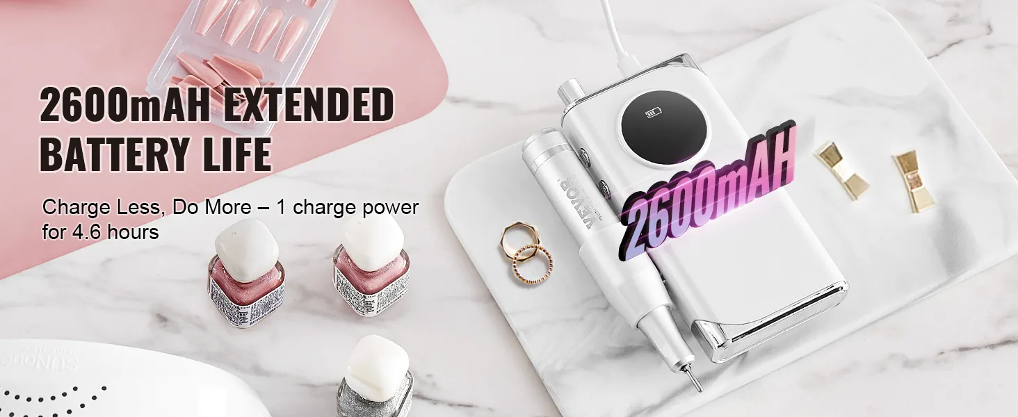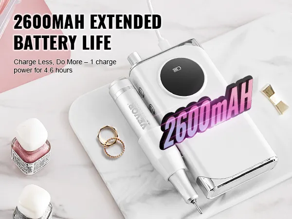 Say goodbye to frequent recharging with our rechargeable cordless nail e-file, featuring a high-capacity battery of up to 2600 mAh. Enjoy up to 4.6 hours of continuous use on a single charge, eliminating the hassle of interruptions during your nail care routine.