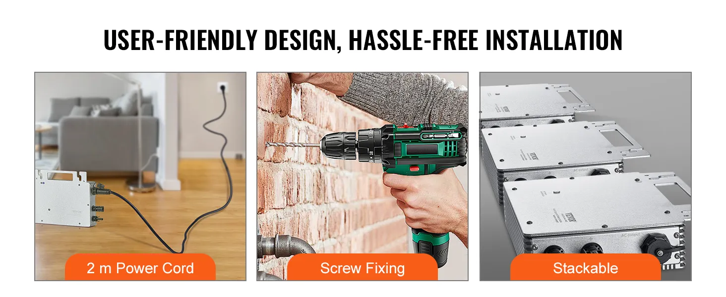 Dankzij de gestroomlijnde behuizing, het netsnoer van 2 meter en de handige haakstructuur is de installatie een fluitje van een cent. U kunt meerdere omvormers stapelen om uw systeem te schalen naarmate uw behoeften groeien, waardoor u een gebruiksvriendelijke ervaring krijgt die meegroeit met uw energiebehoeften.