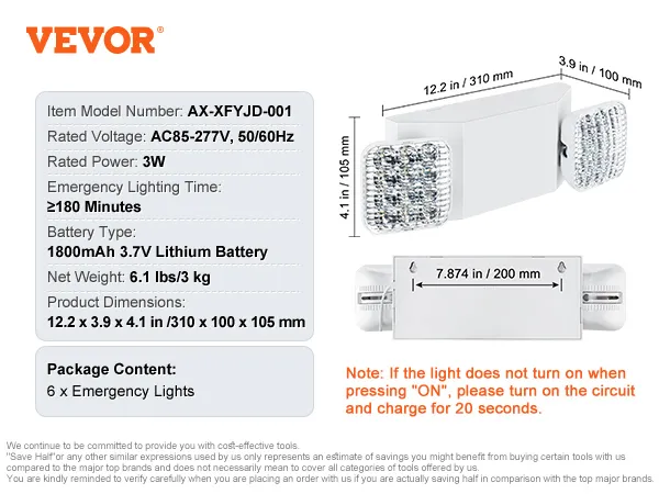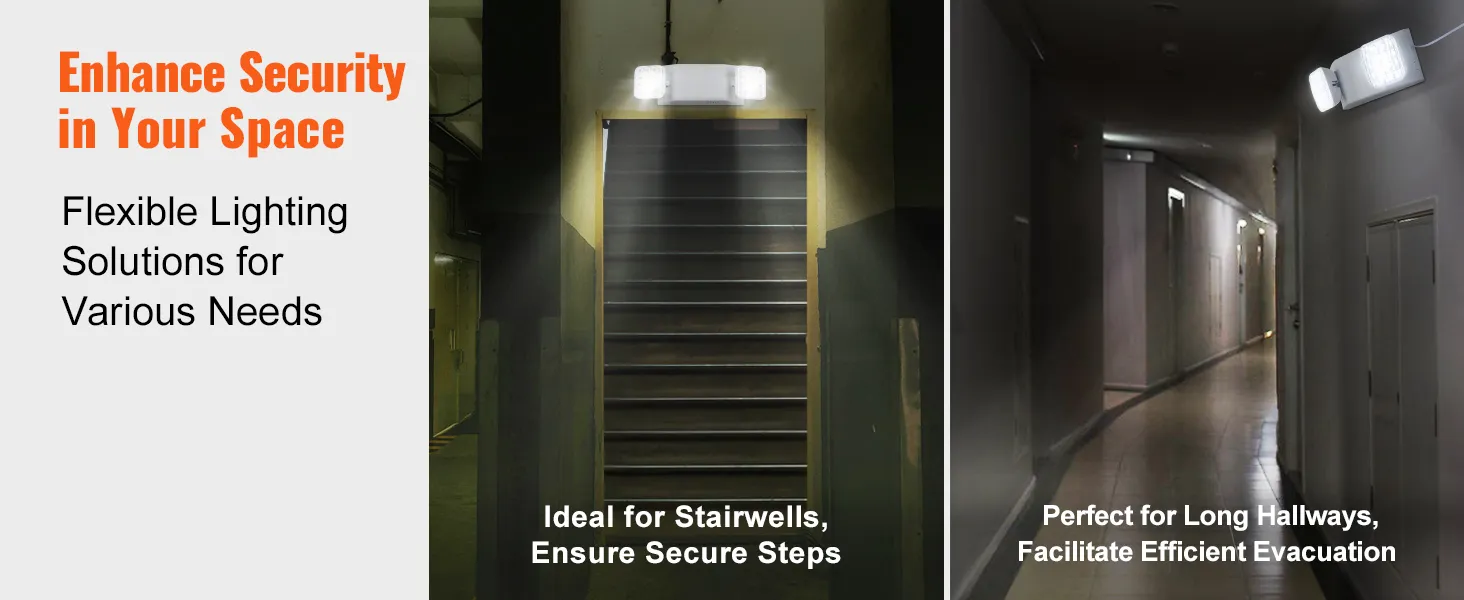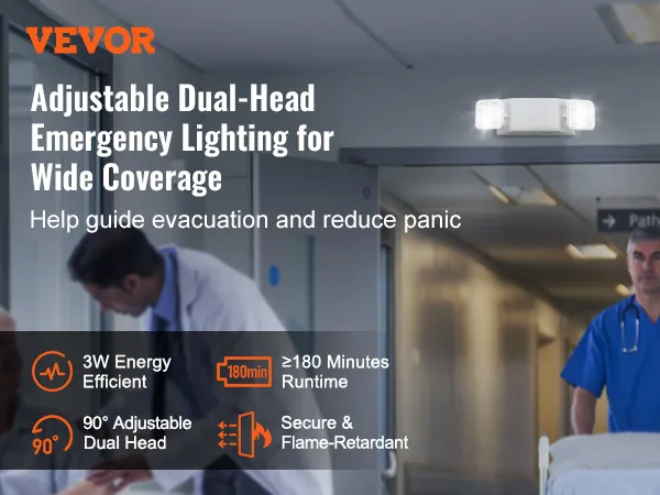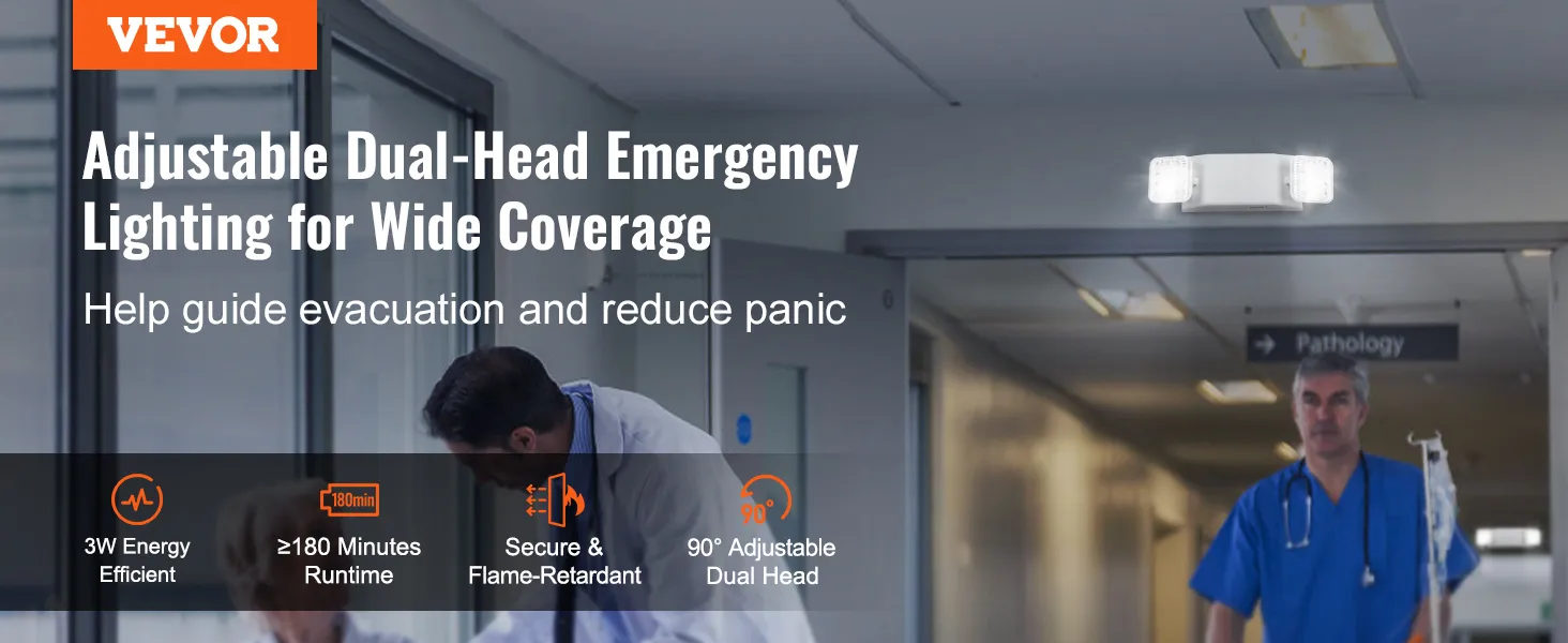 Schijn helder met LED-noodverlichting: Verlicht elke situatie met onze 3W LED-noodverlichting met twee koppen. Elke kop heeft 12 LED-chips voor voldoende, consistente helderheid. Of het nu gaat om een stroomstoring, brand, stofstorm, storm of andere noodsituatie, het ondersteunt uw team bij een veilige en efficiënte evacuatie.