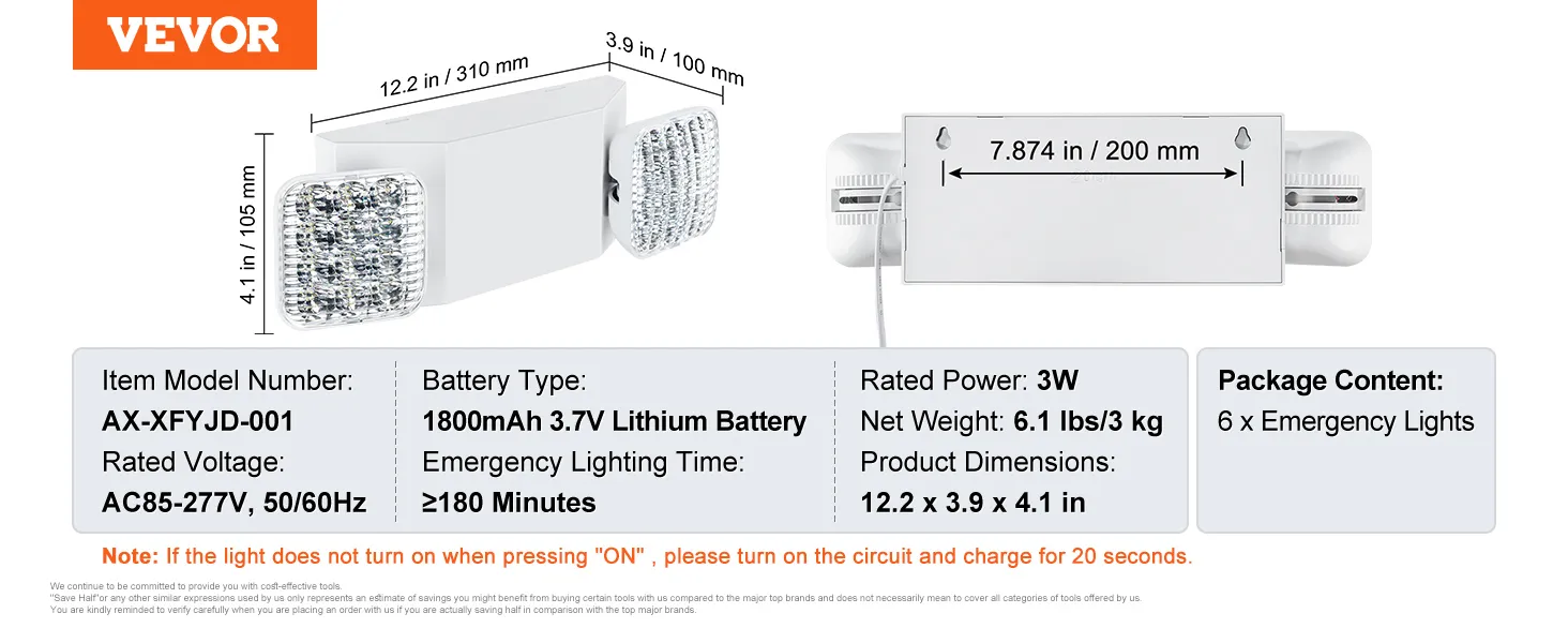 VEVOR 6-pack commerciële noodverlichting, 3W witte LED-uitgangsverlichting met 180 minuten reservebatterij, verstelbare vierkante kop met 2 LED's, plafond- of muurmontage voor stroomuitval in bedrijven