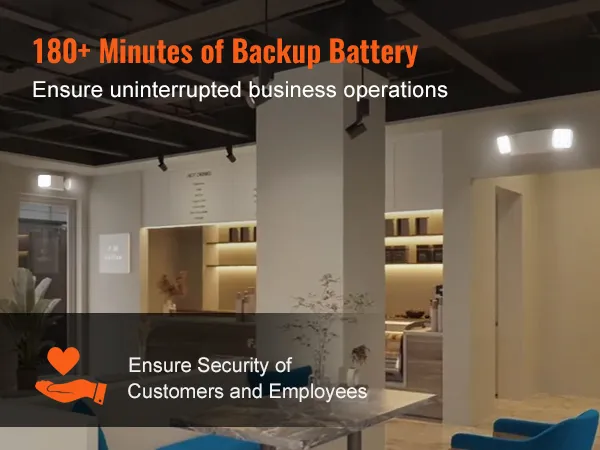 Met een ingebouwde oplaadbare batterij van 1800 mAh biedt onze commerciële noodverlichting meer dan 180 minuten continu licht tijdens stroomuitval. Het is perfect voor cafés, winkelcentra, studio's en meer en zorgt voor een soepele werking.