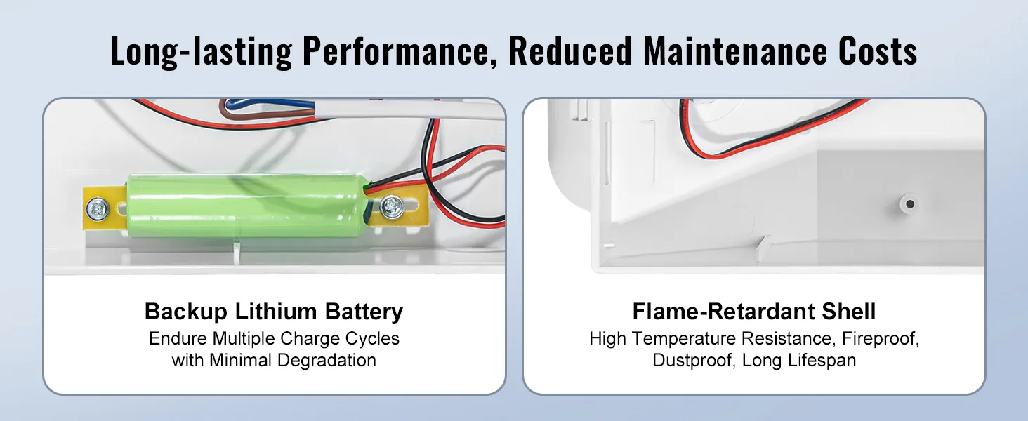 Vlambestendige beschermhoes: Onze commerciële noodverlichting heeft een brandwerend ontwerp met vlamvertragende materialen die de verspreiding van brand vertragen, het risico op letsel minimaliseren en alle betrokkenen de cruciale tijd geven om veilig te evacueren. Het is uw betrouwbare metgezel in noodgevallen!