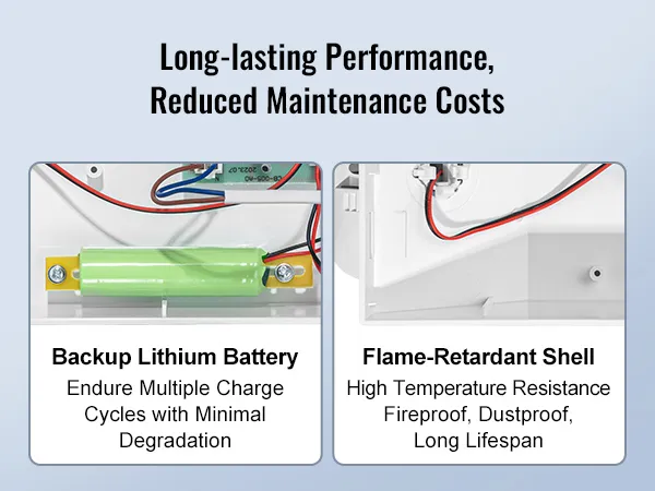 Flame-resistant Protective Shell: Our commercial emergency light fixtures feature a fireproof design with flame-retardant materials, helping to slow down fire spread, minimizing the risk of injury, and giving everyone crucial time to evacuate securely. It's your trusted companion in emergencies!