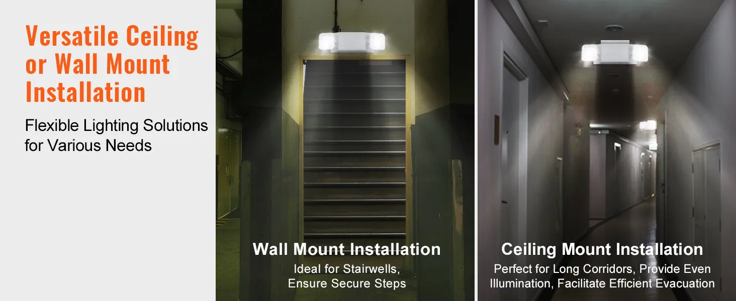 Enjoy the flexibility of ceiling or wall mounting with our emergency exit lighting fixture, adapting effortlessly to your lighting needs. Wall mount it in stairwells for secure, illuminated steps, or ceiling mount it for even lighting that aids in efficient evacuation.