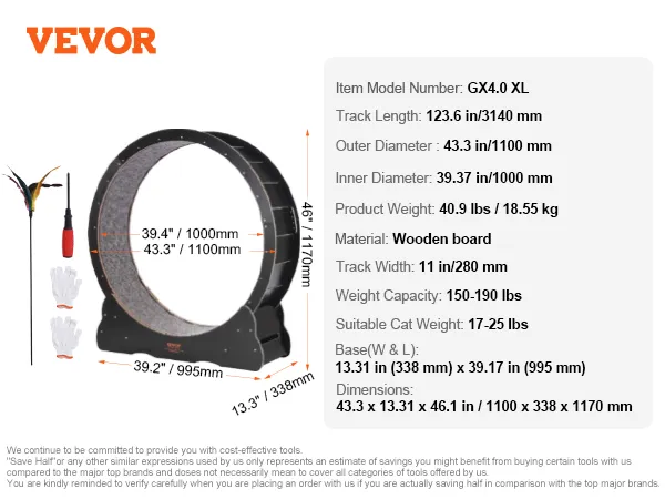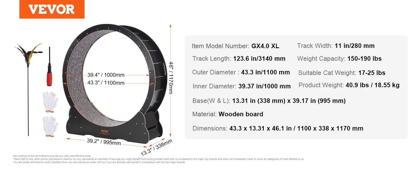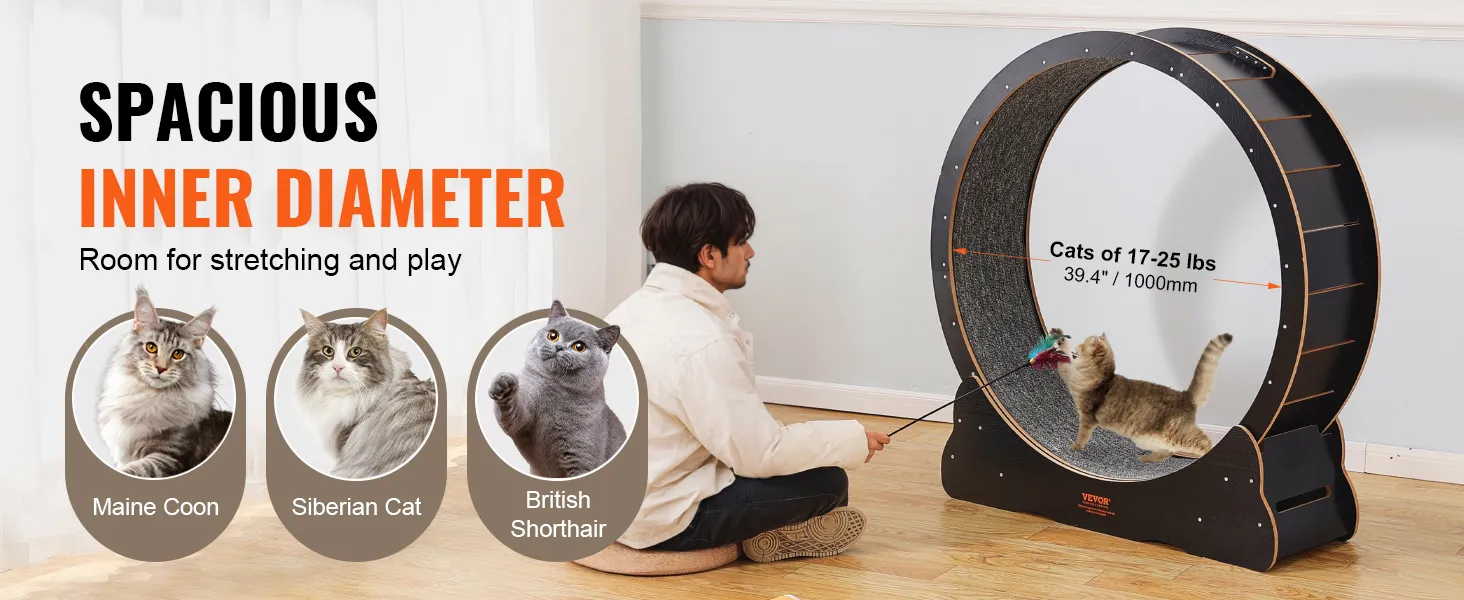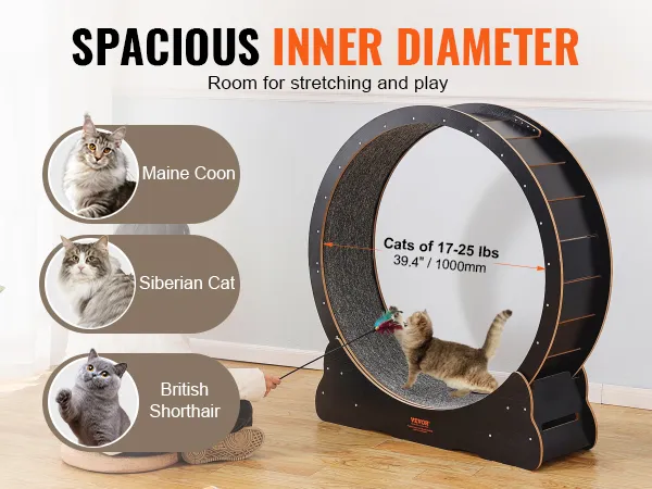 Geschikt voor alle kattengroottes: met een buitendiameter van 43,3 inch / 1100 mm en een binnendiameter van 39,37 inch / 1000 mm is dit kattenwiel geschikt voor katten van alle maten en ondersteunt kattenliefhebbers tot 25 pond. Hierdoor kunnen uw katten zich uitstrekken en vrij rondrennen, waardoor ze hun energie volledig kunnen uiten.