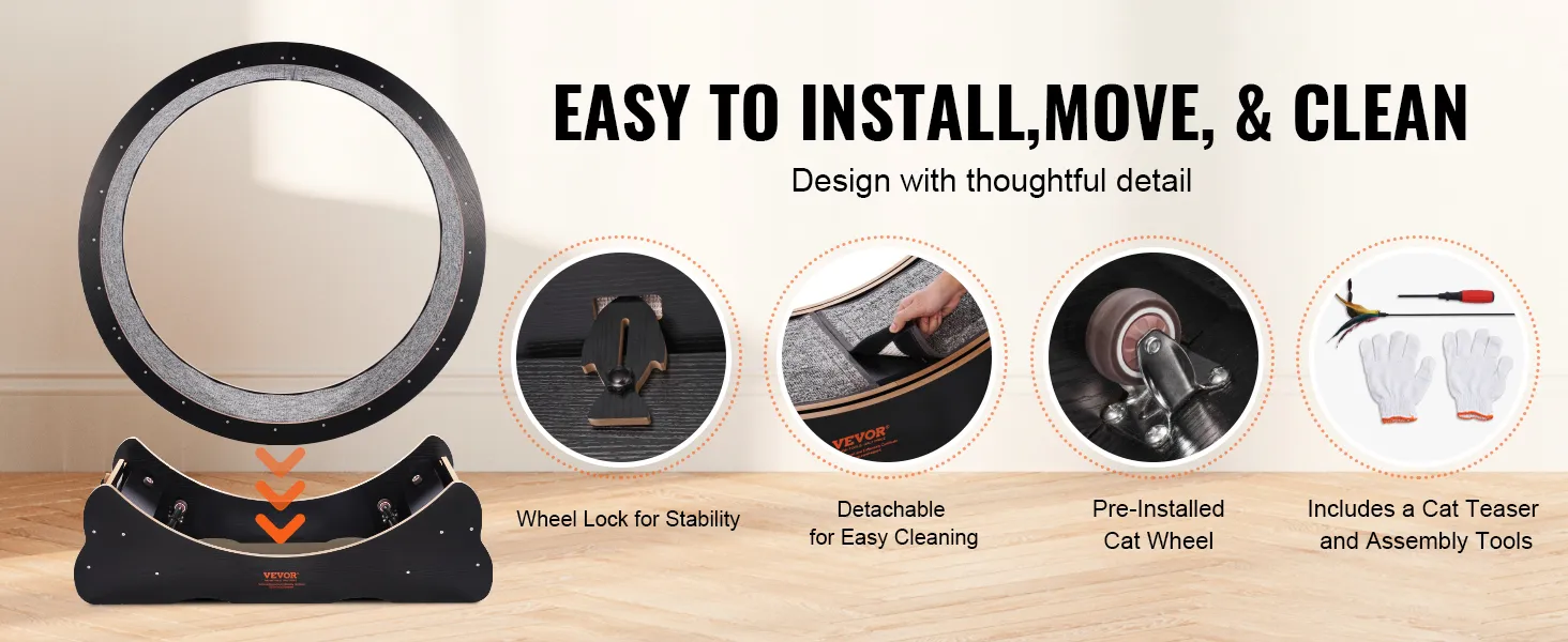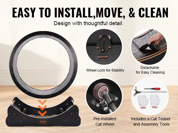 Gebruiksvriendelijk ontwerp: eenvoudige installatie met vooraf geïnstalleerde expansieschroeven en wielen, waardoor u kostbare tijd bespaart. Meegeleverde accessoires zoals handschoenen, een schroevendraaier en een kattenspeeltje zorgen voor extra gemak. Deze loopband voor katten is dankzij de krasbestendige, verwijderbare draagmat eenvoudig schoon te maken en kan eenvoudig worden schoongemaakt met een doek of spons.