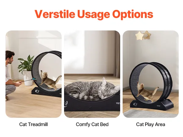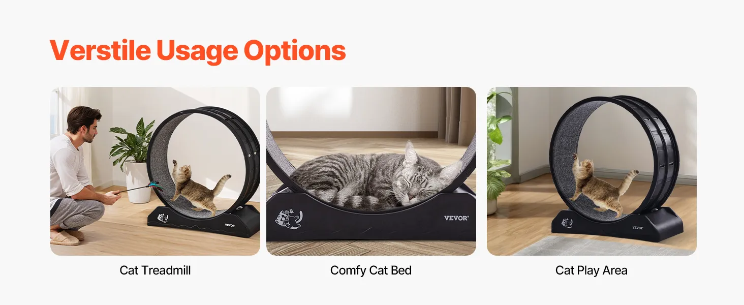 Veelzijdige loopband: Waarom genoegen nemen met slechts één loopband? Onze veelzijdige kattenloopband is voorzien van een remsysteem voor stationair spelen, waardoor hij verandert in een interactief speelgoed, een gezellig kattenbed en een stijlvol meubelstuk in één. Uw kat kan naar hartenlust rennen, draaien, klimmen en dutten, wat zorgt voor eindeloos vermaak en beweging. Laat het plezier beginnen!