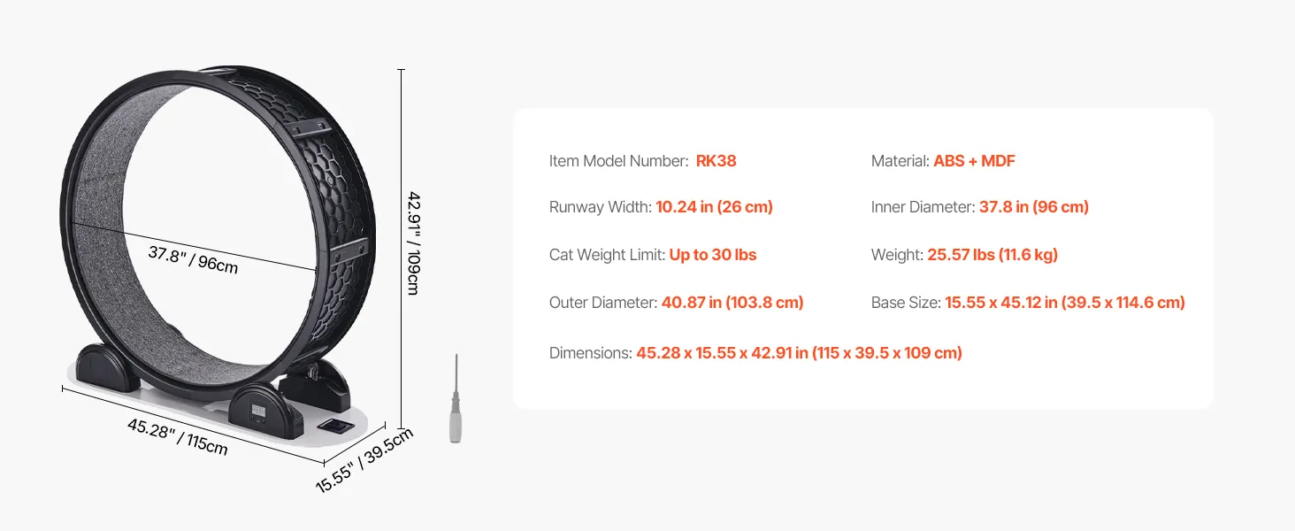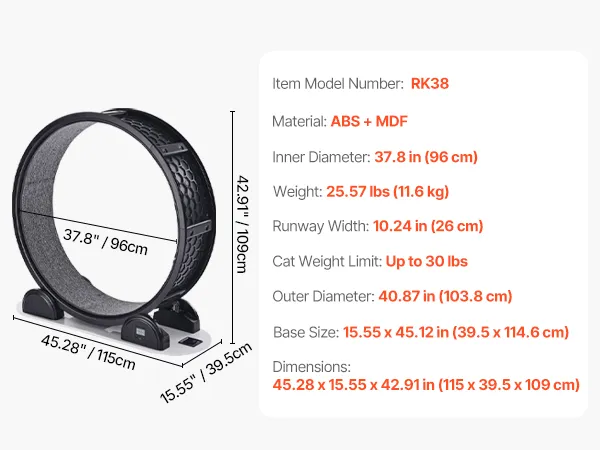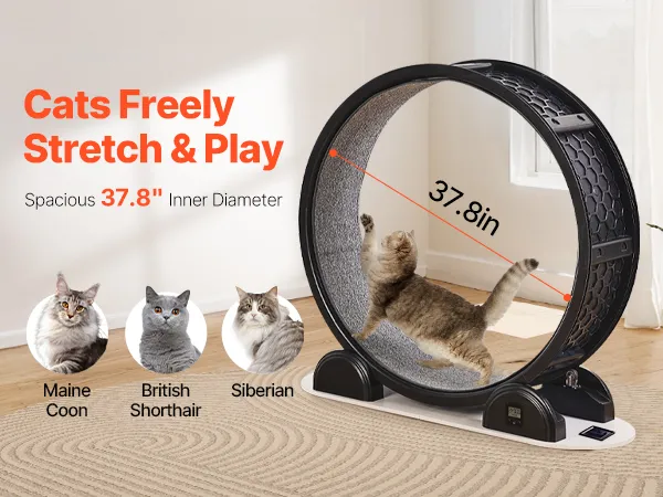 Ideal for Most Breeds: With a spacious internal length of 37.8 in (960 mm) and a width of 10.24 in (260 mm), this cat running wheel is ideal for cats up to 30 lbs, including popular breeds like Maine Coons, British Shorthairs, and Siberians. Let your cat stretch out and unleash their energy in style!