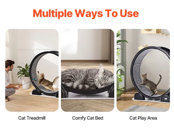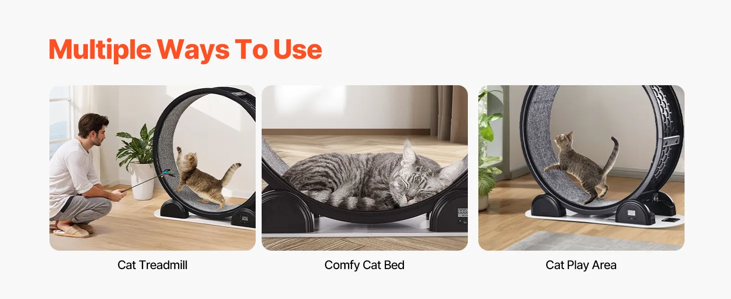 Multi-Functional Fun: More than just a treadmill, this versatile cat treadmill can transform into an interactive toy, cozy cat bed, or stylish furniture. With a locking feature for stationary play, it supports running, spinning, climbing, and napping—providing endless joy and entertainment for your beloved pet!