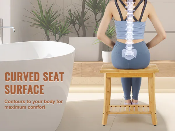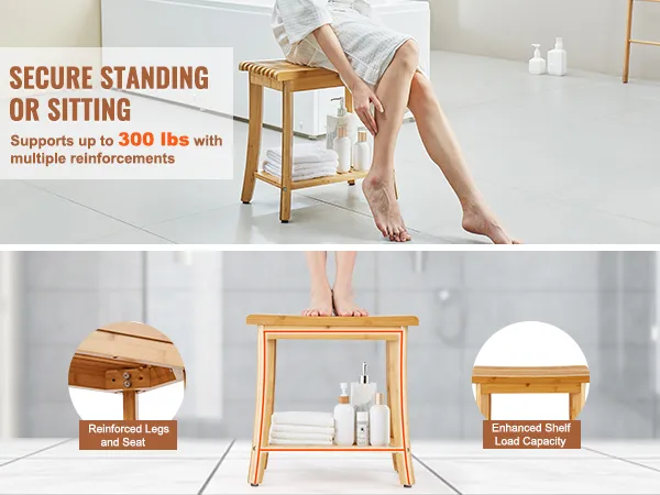 Draagvermogen van 300 lbs, meerlaagse versteviging: Ontdek onze stevige douchekruk die tot 149,7 kg kan dragen en u veiligheid biedt, of u nu staat of zit. Geniet van voldoende opbergruimte voor meerdere toiletartikelen of boeken. Deze voordelen worden nog verder versterkt door diverse verstevigingsdetails: versterkte panelen onder de zitting, wigvormige stutten op de poten en externe schroeven voor de plank.
