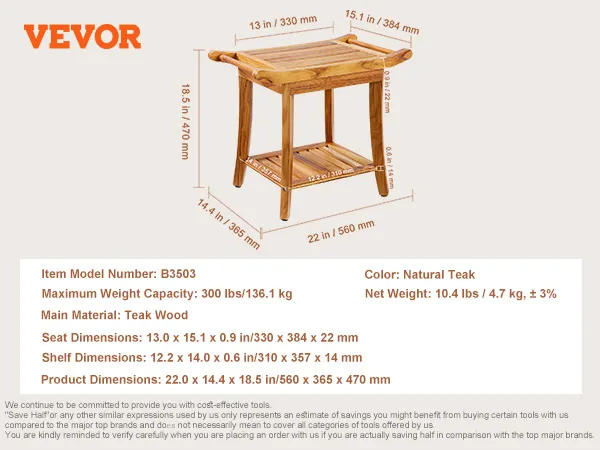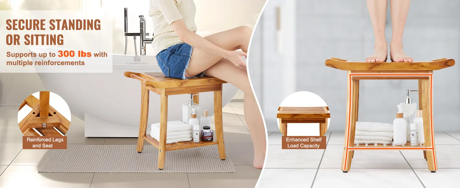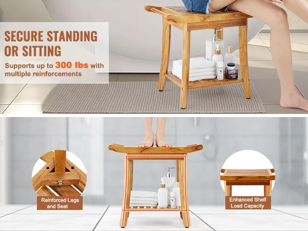 300 lbs Capacity, Multi-layer Reinforcement: Discover our robust shower stool designed to support up to 300 lbs / 136.1 kg, ensuring security whether you're standing or seated. Enjoy ample storage space for multiple toiletries or books with confidence. These benefits are enhanced by multiple reinforcement details: reinforced panels under the seat, wedge-shaped braces on the legs, and externally secured screws for the shelf.