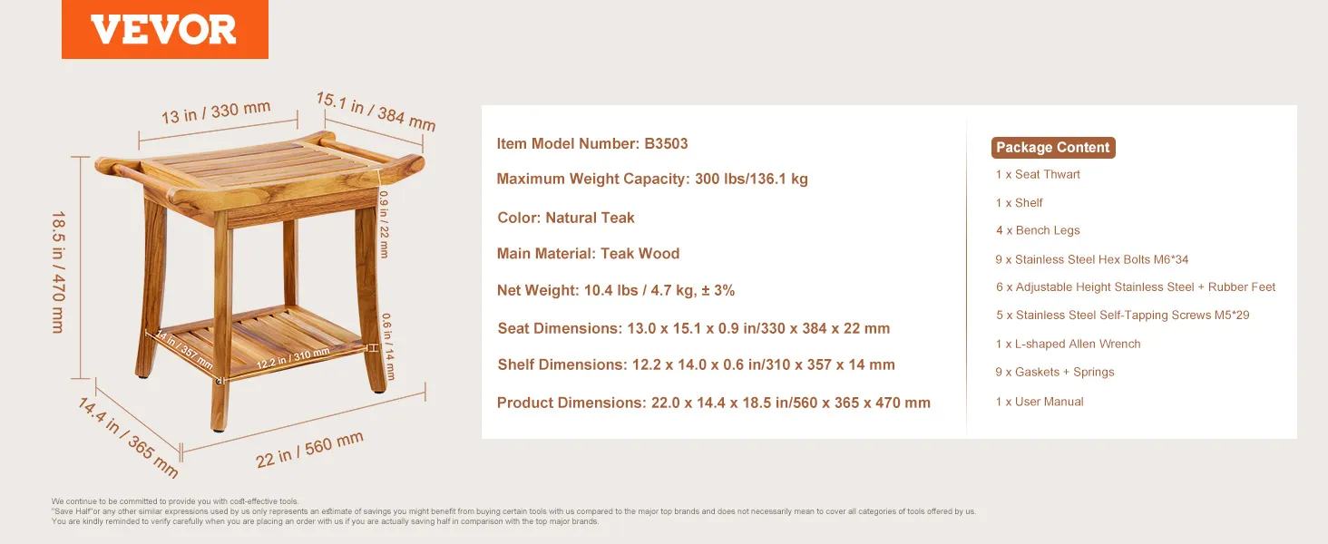 Durable Teak Wood, Built to Last: Our shower bench is crafted from 100% solid teak wood, renowned for its superior hardness compared to bamboo, standing strong and resilient whether indoors or outdoors. Infused with natural oils and coated with a waterproof finish, it ensures efficient drainage and quick drying, minimizing mold risks in humid environments like your shower. Experience the unmatched durability of our shower stool!