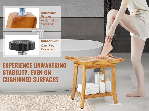 Our bathroom shower bench seat adapts effortlessly to uneven floors. Adjust the height with ease using stainless steel screws, ensuring stability and rust resistance even on slightly sloped surfaces. Plus, the rubber feet enhance grip without scratching your floor.