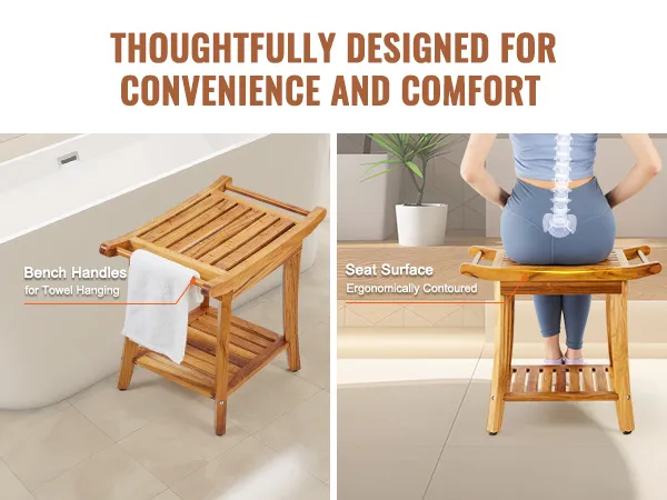 Enhanced with dual handles for easy mobility and towel hanging, our teak wood shower chair features a gently contoured seat for comfortable sitting posture.
