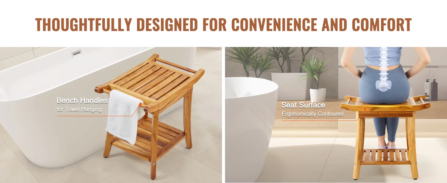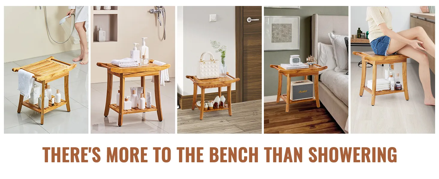Looking for a bathroom organizer or a reliable shower seat? Look no further than our waterproof teak wood shower bench. Stronger than bamboo, it holds up to 300 lbs with dual-layer construction. With the handle, it can be used as a side table or shoe rack and fits the bathroom and living room.