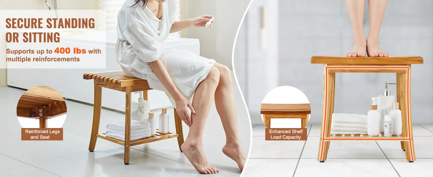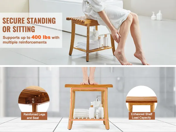 400 lbs Capacity, Multi-layer Reinforcement: Discover our robust shower stool designed to support up to 400 lbs / 180 kg, ensuring security whether you're standing or seated. Enjoy ample storage space for multiple toiletries or books with confidence. These benefits are enhanced by multiple reinforcement details: reinforced panels under the seat, wedge-shaped braces on the legs, and externally secured screws for the shelf.
