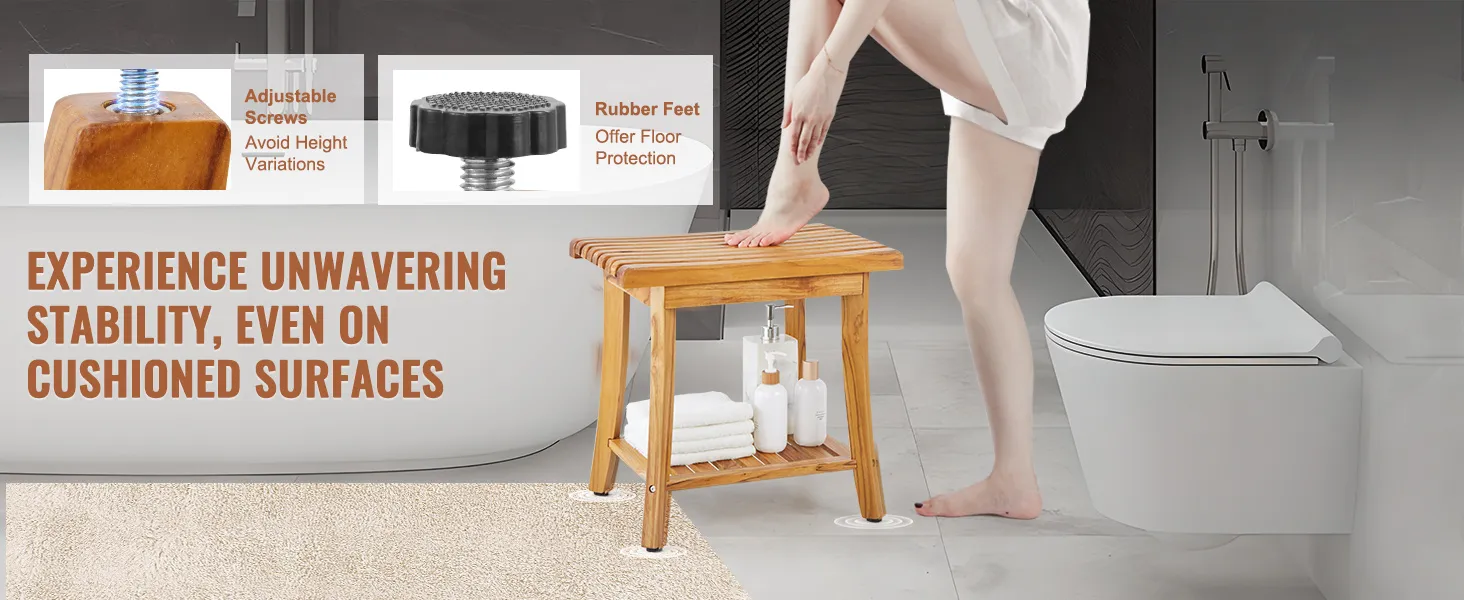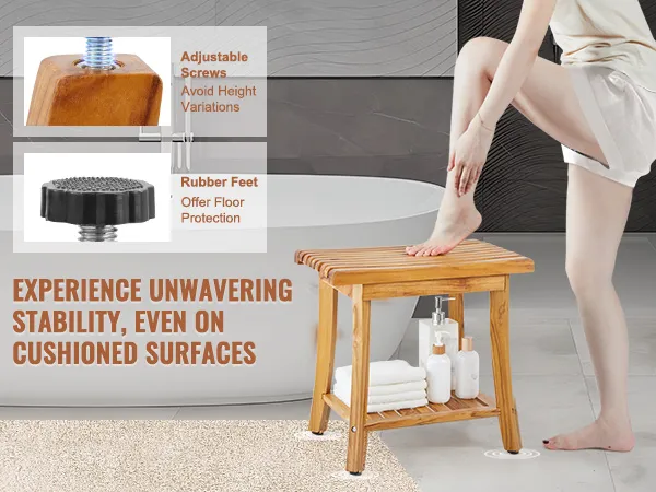 Our bathroom shower bench seat adapts effortlessly to uneven floors. Adjust the height with ease using stainless steel screws, ensuring stability and rust resistance even on slightly sloped surfaces. Plus, the rubber feet enhance grip without scratching your floor.