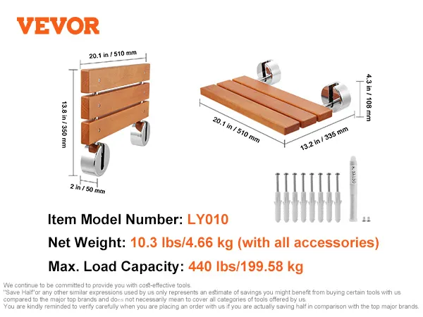 VEVOR Folding Teak Shower Seat, 20.1" x 13.2" Unfolded, Wall Mounted Fold Up Shower Bench with 440 lbs Load Capacity, Space Saving Home Care Fold Down Shower Chair, for Seniors Pregnant Women Children