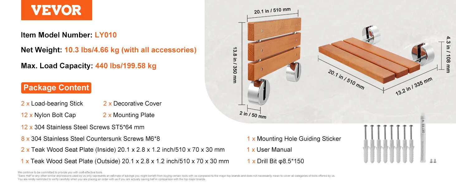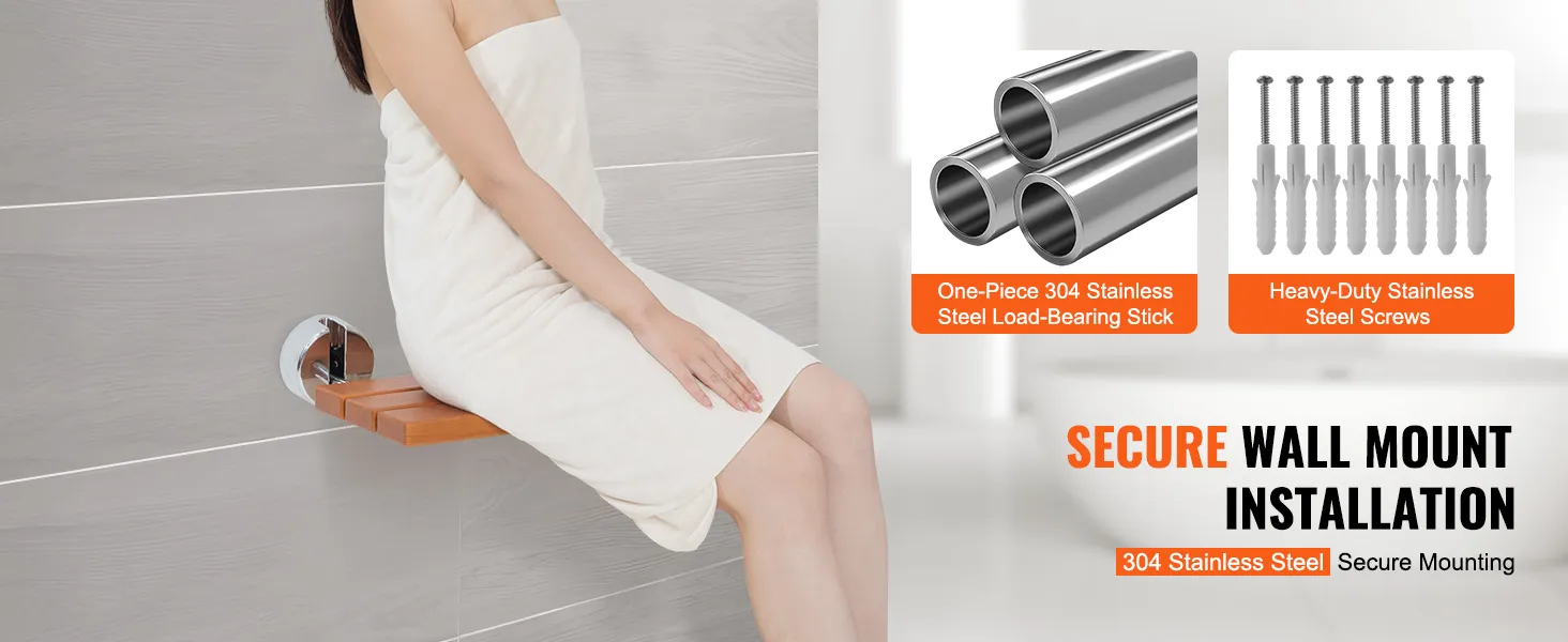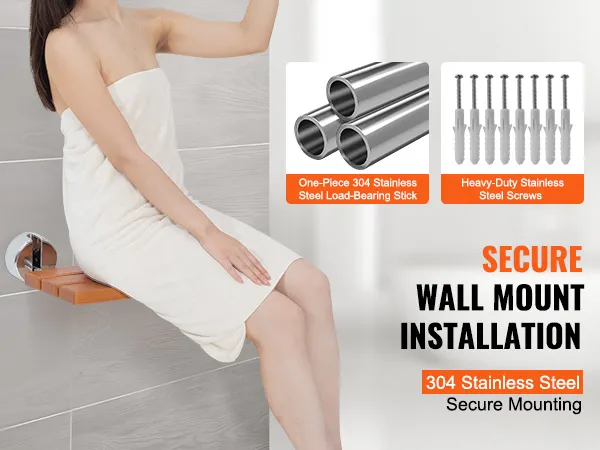 Drill-Hole Wall Mounting: Thoughtfully equipped with mounting hole guiding sticker for precise drilling – no need for additional markings with a pen. Complete with bolt cap, 304 stainless steel screws, and an extra set of 2 stainless steel screws and bolt caps for added convenience. Note: Install our folding shower seat on load-bearing solid walls.