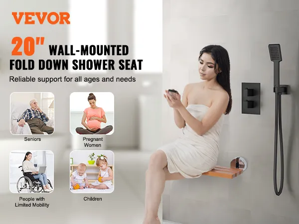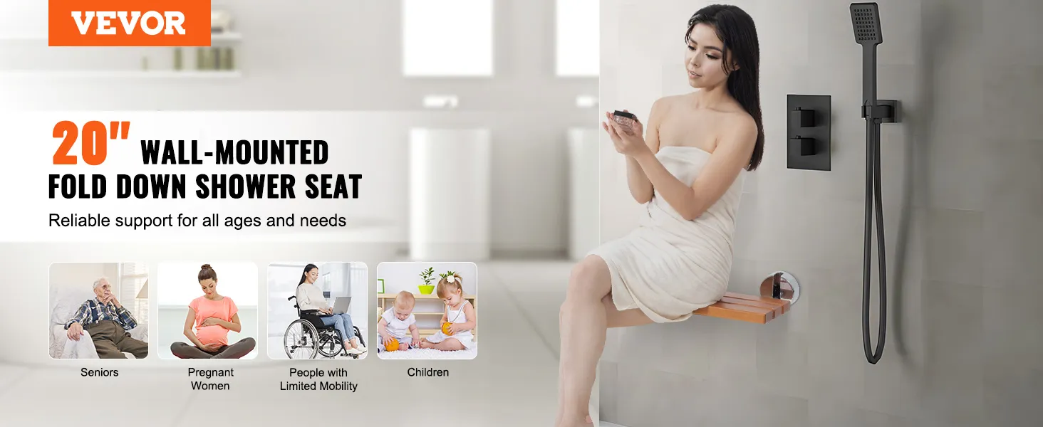 20 in Widened & High Load-Bearing: Elevate your shower experience with our wall-mounted shower seat! Designed with 304 stainless steel support tube, this fold up shower seat boasts an impressive load capacity of up to 440 lbs (199.58 kg). The widened seat enhances comfort, providing a reliable and comfortable seating option for seniors, pregnant women, children, and people with limited mobility.