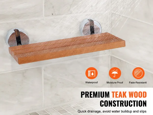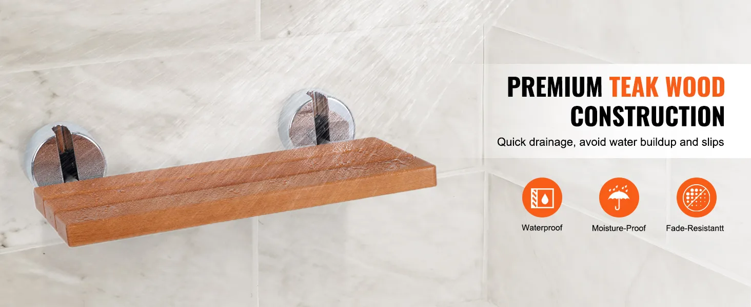 Premium Teak Wood Material: Experience luxury and durability with our premium wall mounted teak wood shower seat. Naturally water and moisture-resistant, this thick, smooth teak wood ensures longevity and maintains its beautiful appearance even in humid environments. It facilitates quick drainage, significantly reducing the risk of slips from water accumulation, making it the perfect addition to any bathroom.