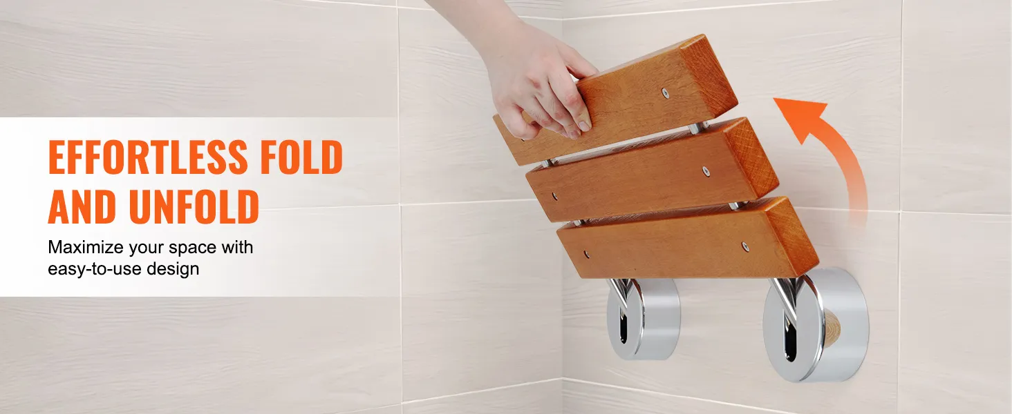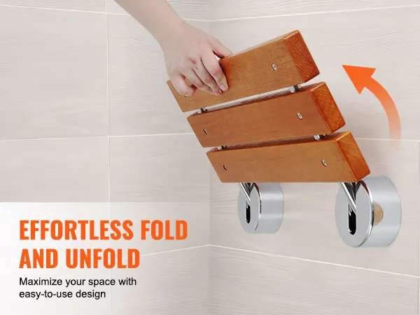 Seamless Folding and Unfolding: Effortlessly fold and unfold our wall mount shower seat for a seamless experience. When not in use, simply fold it flat against the wall to save space, keeping your bathroom tidy and spacious. Enjoy smooth, silent operation every time you unfold or fold it back, adding both functionality and elegance to your bathroom.