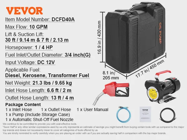 VEVOR Dieselpomp, 12V DC, 10 GPM, 1/4 HP, brandstofpomp met automatische uitschakeling van het pistool, hoge doorstroming, inlaat- en uitlaatslang voor diesel, kerosine, transformatorbrandstof