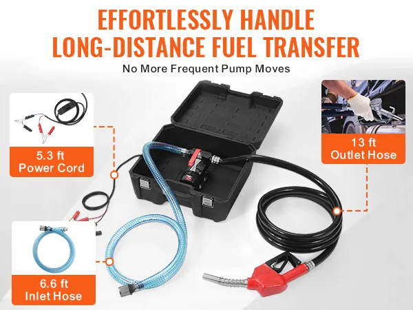 Uitgebreide accessoires: Deze brandstofpompset bevat een rubberen uitlaatslang van 13 ft/4 m, een PVC-inlaatslang van 6,6 ft/2 m en een automatisch uitschakelend brandstofmondstuk. De inlaatslang is aan het uiteinde uitgerust met een metalen gaasfilter om te voorkomen dat verontreinigingen de pomp binnendringen tijdens de brandstoftoevoer, waardoor een schone en efficiënte werking wordt gegarandeerd.
