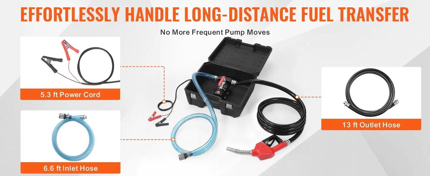 De dieselpomp is voorzien van een rubberen uitlaatslang van 4 meter lang, die bekend staat om zijn tanken over lange afstanden, weerstand tegen knopen en hoge doorstroming. Ook inbegrepen is een doorzichtige toevoerslang van 1,8 meter met een metalen gaasfilter.