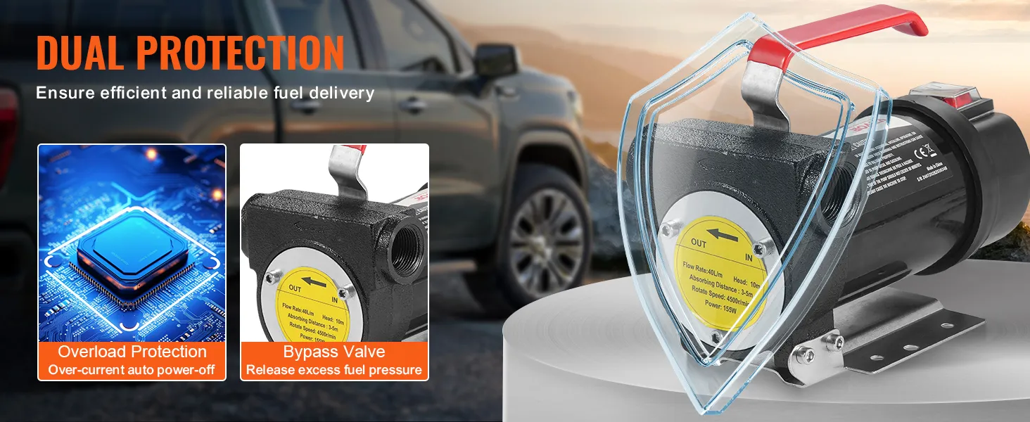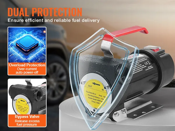 De overbelastingsbeveiliging schakelt de pomp automatisch uit als de belasting te hoog is. De omloopklep zorgt voor een continue brandstofstroom wanneer de brandstoftoevoerslang verstopt is en beschermt de pomp tegen schade veroorzaakt door overmatige druk.
