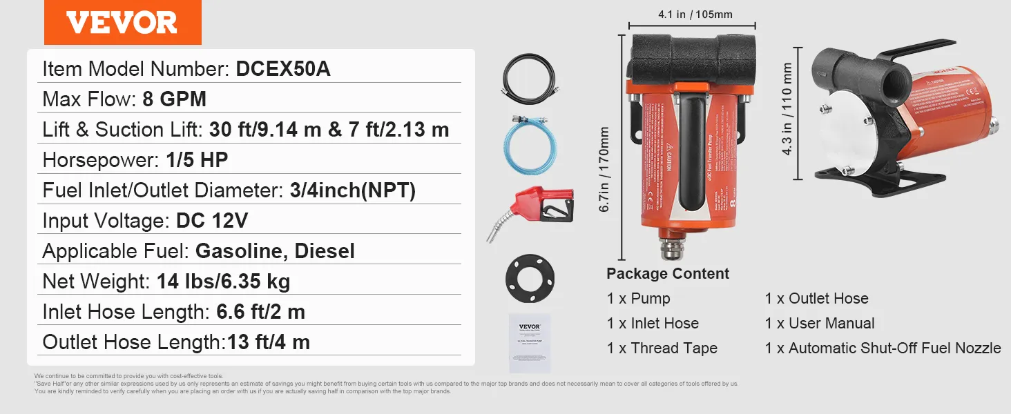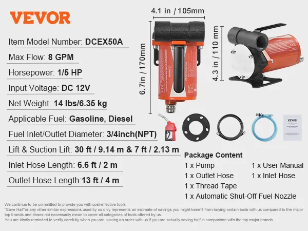 Efficient Fuel Transfer: Equipped with a 1/5 HP high-speed brush-less motor, this fuel transfer pump delivers fuel at up to 8 GPM, with a maximum lift of 30 ft and a suction lift of 7 ft. It can take as little as 4 minutes to fill up a car with a full tank of gas. This pump offers a reliable and speedy fuel delivery experience, making your tasks easier and more convenient.