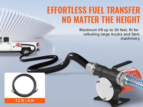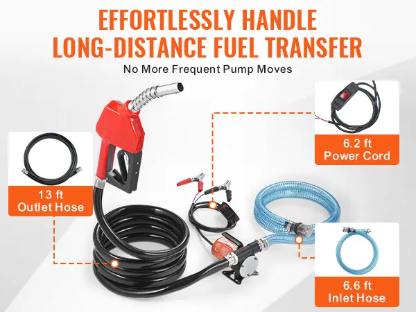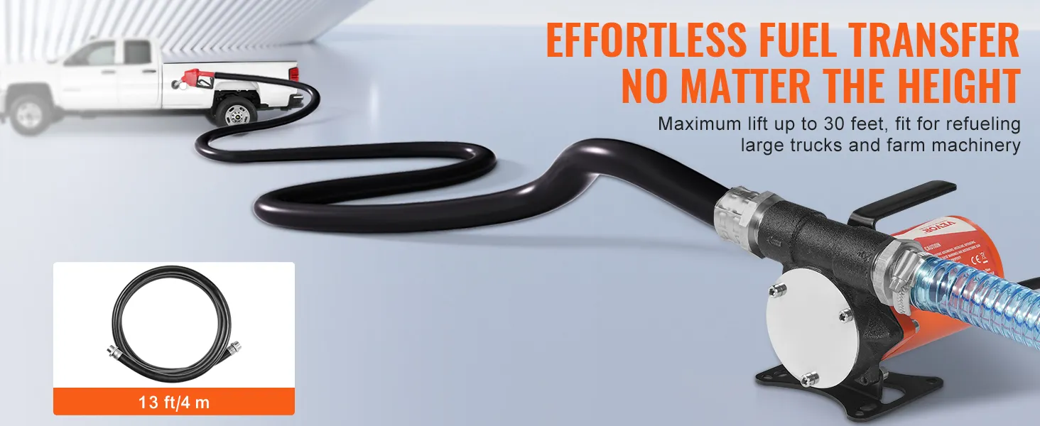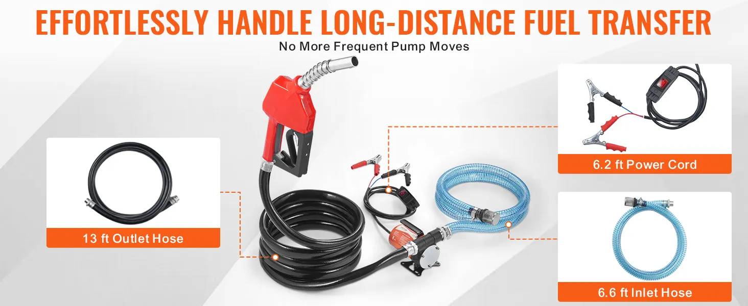 The fuel transfer pump features a 13 ft rubber outlet hose, known for its long-distance refueling, tangle-resistant, and high flow. It also includes a 6.6ft transparent inlet hose with a metal mesh filter to keep impurities out during refueling. It is to make sure that your pump is in tip-top shape.