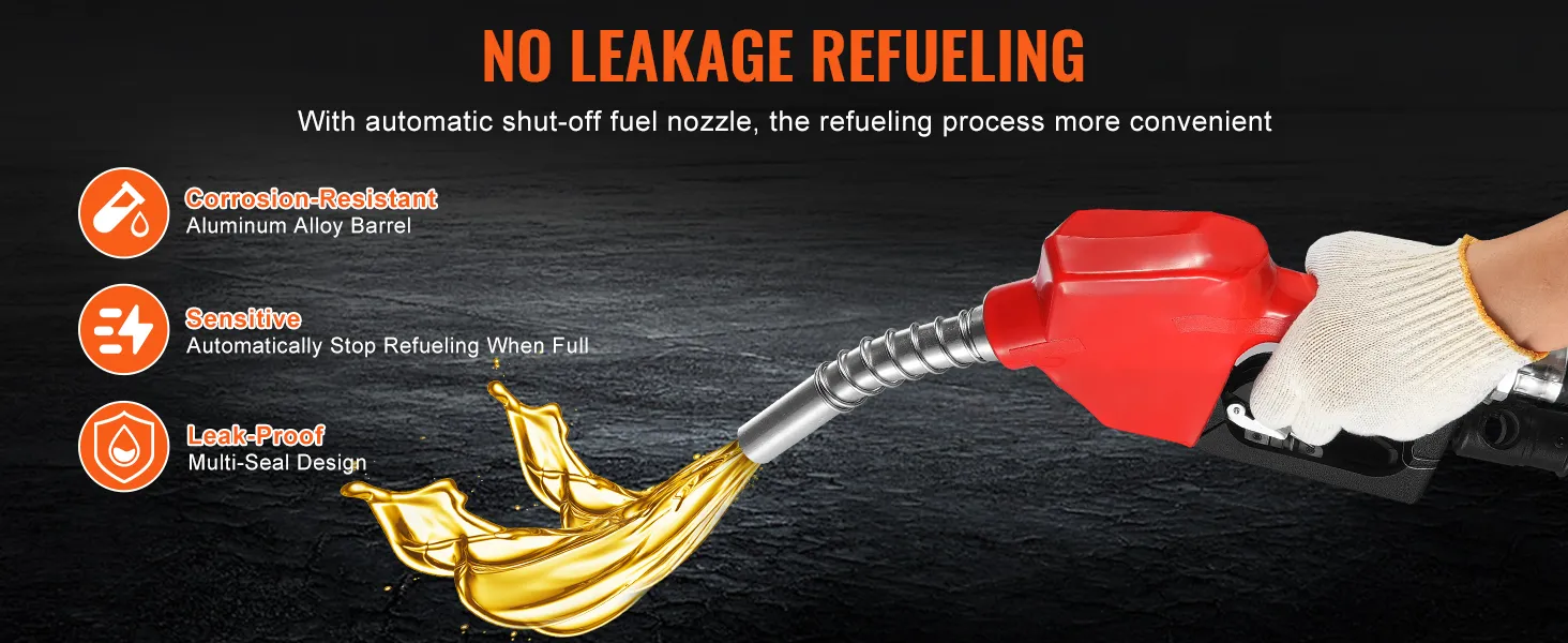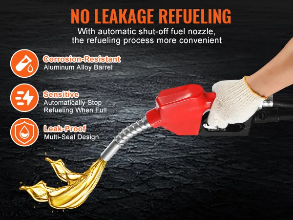 Automatic Fuel Nozzle: This fuel transfer pump comes with an automatic shut-off fuel nozzle. During fuel delivery, simply press and release the handle switch. There's no need to monitor the fuel delivery level, as the nozzle will automatically stop when the tank is full, avoiding overflows and ensuring a hassle-free fuel delivery experience.