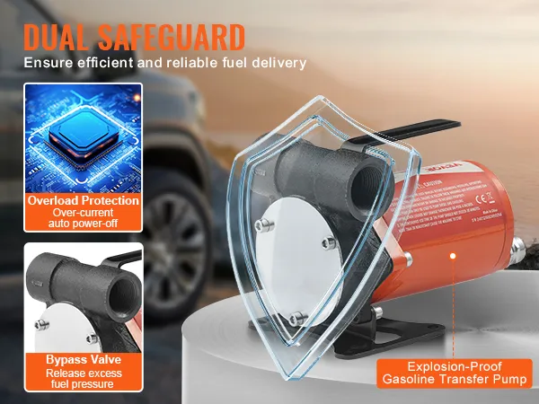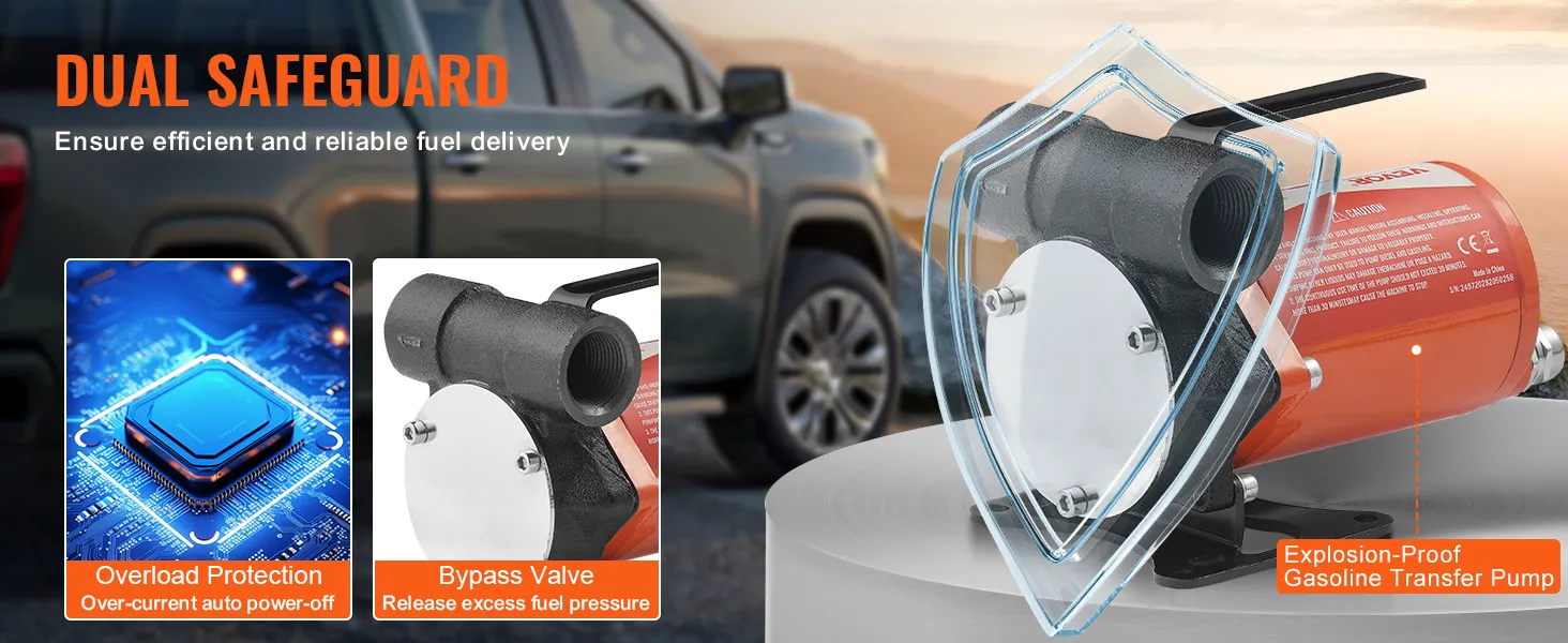 The overload protection automatically shuts down the pump when the load is too high, avoiding overheating and reducing motor strain. The bypass valve maintains continuous fuel flow if the fuel transfer hose is blocked, safeguarding the pump from high-pressure damage