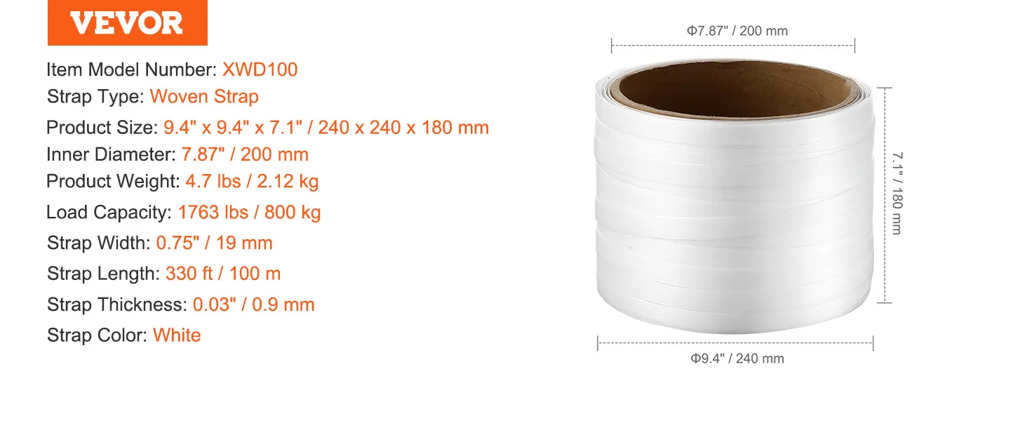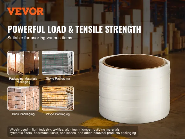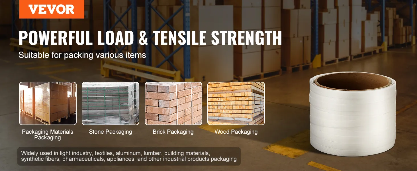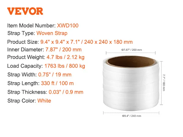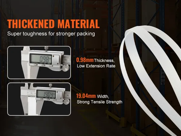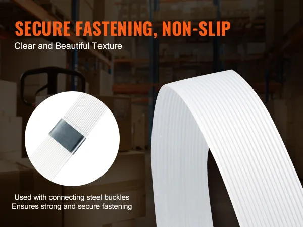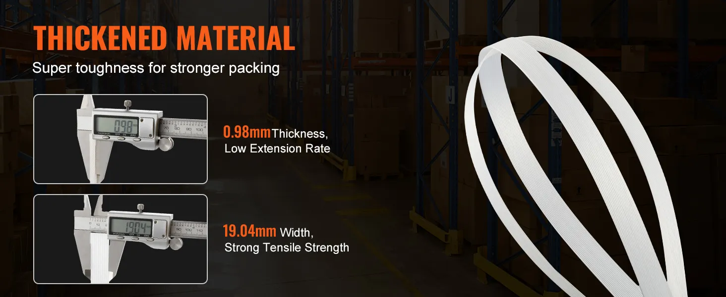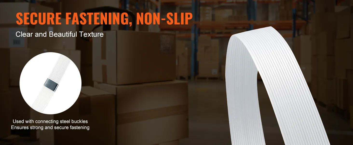 Robuuste ondersteuning: onze riemrol is gemaakt van hoogwaardig vezelmateriaal en biedt een duurzaamheid die vergelijkbaar is met stalen riemen. Met een dikte van 0,03 inch / 0,9 mm en een breedte van 0,75 inch / 19 mm ondersteunt hij tot 1763 lbs / 800 kg. De tape heeft een uitstekende treksterkte en slijtvastheid, waardoor deze perfect is om uw goederen te beschermen tegen schokken en slijtage tijdens transport.