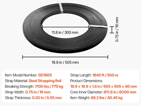 500 m flexibele omsnoering: Deze rol staalband is 500 m lang, 19 mm breed en 0,55 mm dik. Hij is compatibel met VEVOR pneumatische omsnoeringsmachines en -karren, voor eenvoudig en probleemloos gebruik.