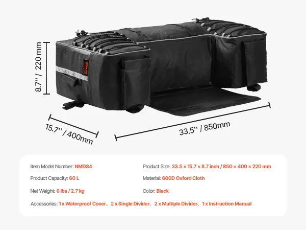 Deze ATV-staarttas van 60 liter biedt de perfecte combinatie van functionaliteit en gemak. Met een royale inhoud van 60 liter bergt u uw essentiële spullen efficiënt op en houdt u ze binnen handbereik. Gemaakt van hoogwaardig 600D Oxford-materiaal, biedt hij duurzame bescherming voor uw uitrusting.