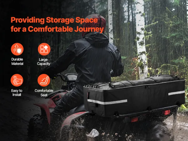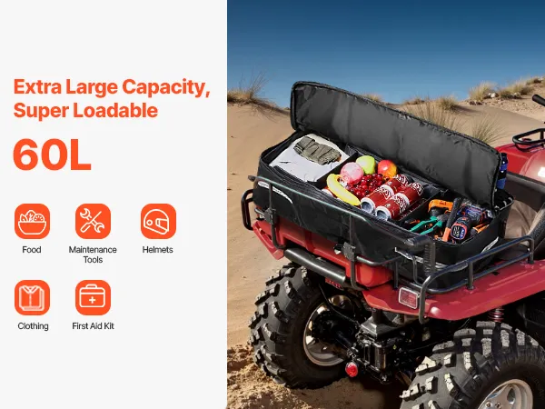 Grote capaciteit van 60 liter: De VEVOR ATV-achtertas van 85,5 x 39,9 x 22,1 cm combineert opbergruimte en een rugsteun in één, met een royale inhoud van 60 liter voor helmen, handschoenen, onderhoudsgereedschap en andere benodigdheden. De ondersteunende rugleuning biedt comfort en rugondersteuning tijdens lange ritten – perfect voor buitenavonturen.