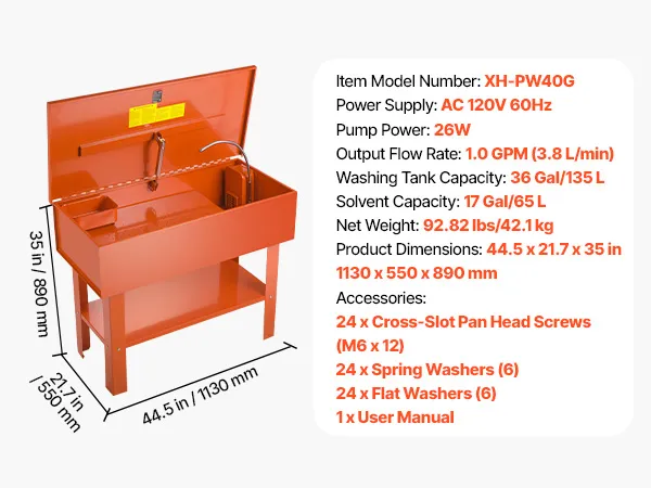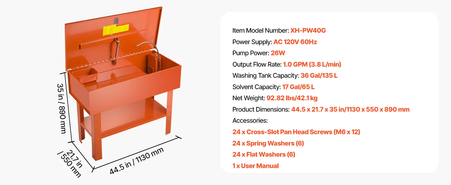 Wide Application: This parts cleaner tank is ideal for auto repair shops, garages, warehouses, and workshops. It efficiently cleans parts of all sizes, including wheel hub bearings, gears, carburetors, valve assemblies, transmission cases, and more