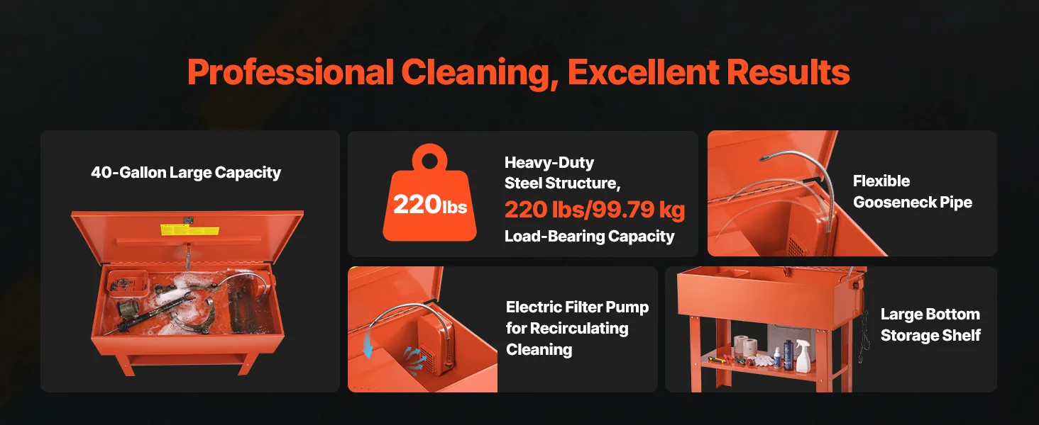 Large Parts Capacity: Made from heavy-duty steel, this parts cleaner is sturdy. Its 40-gallon cleaning tank can support 220 lbs, allowing multiple large parts to be soaked and scrubbed at the same time, saving effort and increasing efficiency