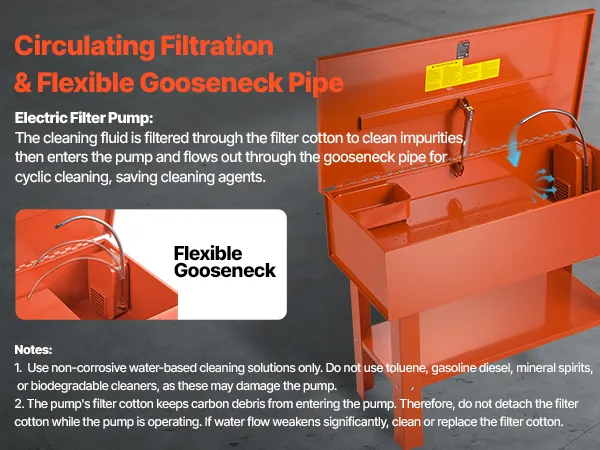 Cyclic Cleaning: Our automotive parts washer provides an electric filtration pump. The cleaning solution passes through a mesh filter, then enters the pump and flows out through the gooseneck tube for circulation, saving detergent