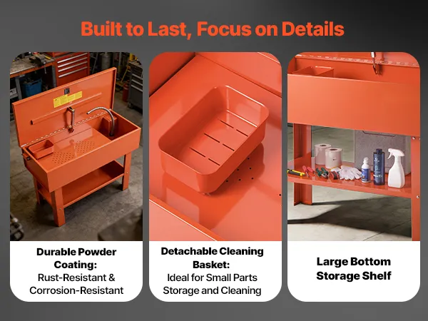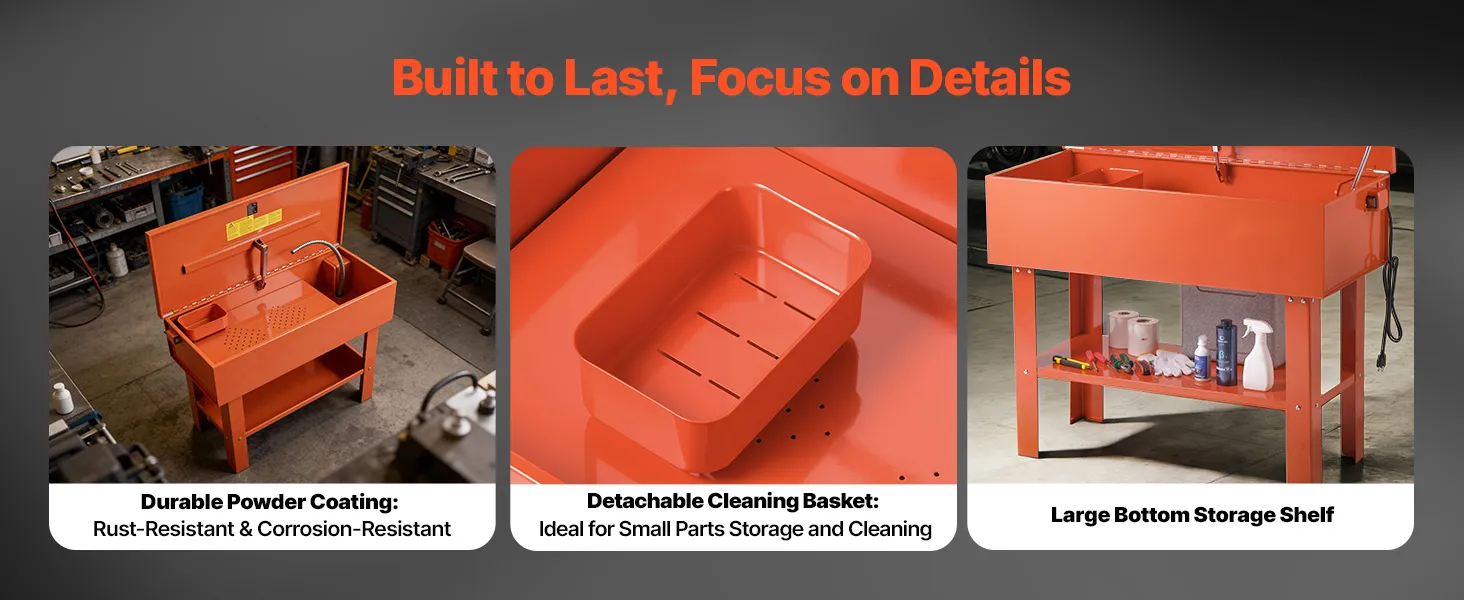 Durable & Practical: Featuring a spacious storage shelf at the bottom, the parts washer cleaner easily organizes various automotive supplies, which is very practical. Crafted from a rust- and corrosion-resistant powder coating, it ensures long-term use