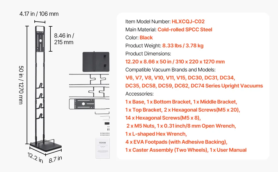 Onze stofzuigerstandaard is voorzien van een stevige basis van 2,06 kg, voorzien van antislipkussentjes en schroefverbindingen voor optimale stabiliteit. Gemaakt van duurzaam koudgewalst SPCC-staal, is het bestand tegen buigen en vervorming en biedt het langdurige ondersteuning voor uw stofzuiger.