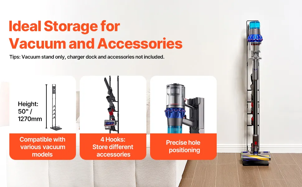 Efficiënte opslag: Deze stofzuigerstandaard is 50 inch / 1270 mm hoog en heeft 4 haken om uw stofzuiger en accessoires netjes geordend te houden en verlies te voorkomen. Het bespaart ruimte, voorkomt dat de stofzuiger per ongeluk valt en beschadigd raakt, verlengt de levensduur van de stofzuiger en zorgt er tegelijkertijd voor dat uw huis opgeruimd blijft.